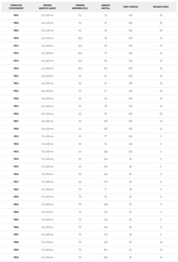 Precintos en bolsas de 100 unidades/50 unidades/25 unidades (*) de poliamida 6.6 (NYLON) con protección UV color negro.
